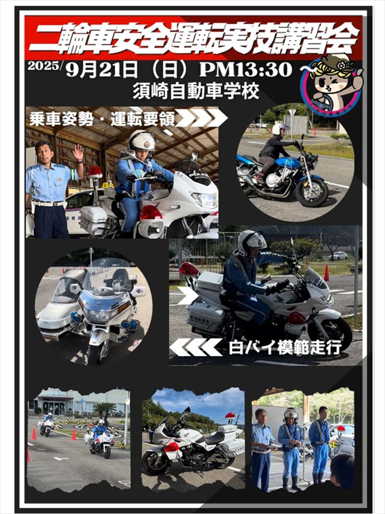 秋の全国交通安全運動初日に須崎警察署と一緒に講習会を開催しました。全国白バイ安全運転競技大会に出場した白バイ隊員及び須崎警察署交通課長に来ていただきました。講習では、二輪車乗車姿勢、スラローム等における運転要領などを受講。その後、コース内を参加した二輪ライダーが運転訓練を行った後、白バイ隊員の模範走行を見学しました。高速でのスラローム、8の字走行は圧巻でした。