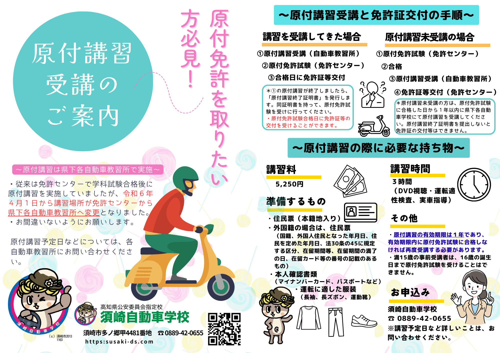 まもなく春休み!学校から原付通学許可がおりれば休み期間中に原付免許を取りに行きたいと考えている高校生も多いのではないでしょうか。原付講習は県下各自動車教習所で行っています。講習予定日などについては事前にお問い合わせください。