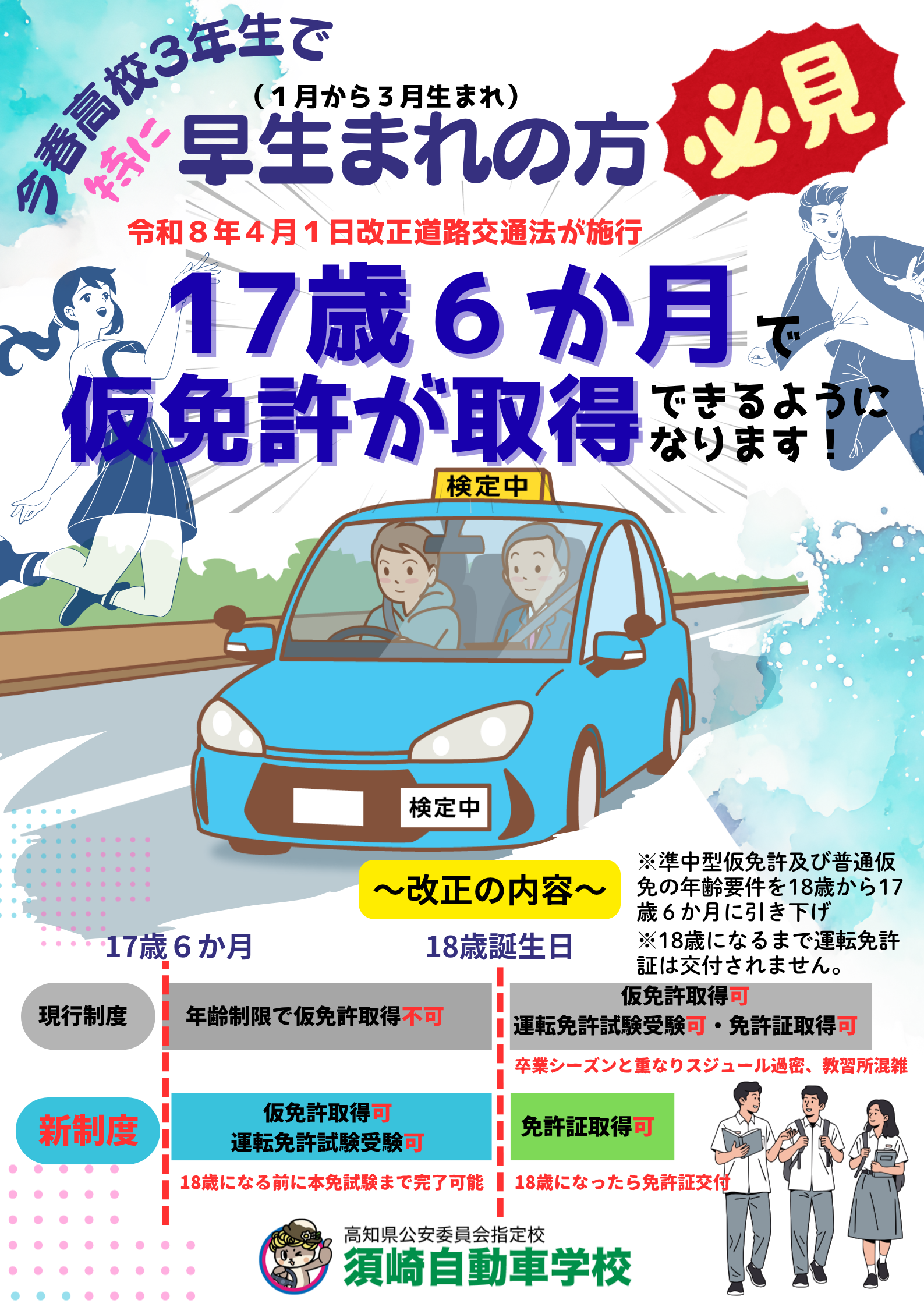 仮免許及び運転免許試験の受験資格にかかる年齢要件が引き下げられます。改正道路交通法の施行により4月1日から準中型・普通仮免許取得可能年齢及び運転免許試験の受験年齢が18歳から17歳6か月に引き下げられます。これによりいわゆる”早生まれ”の高校生であっても卒業までに準中型・普通免許を取得しやすくなります。ただし、18歳未満で運転免許試験に合格したとしても18歳にならなければ運転免許証は交付されません。