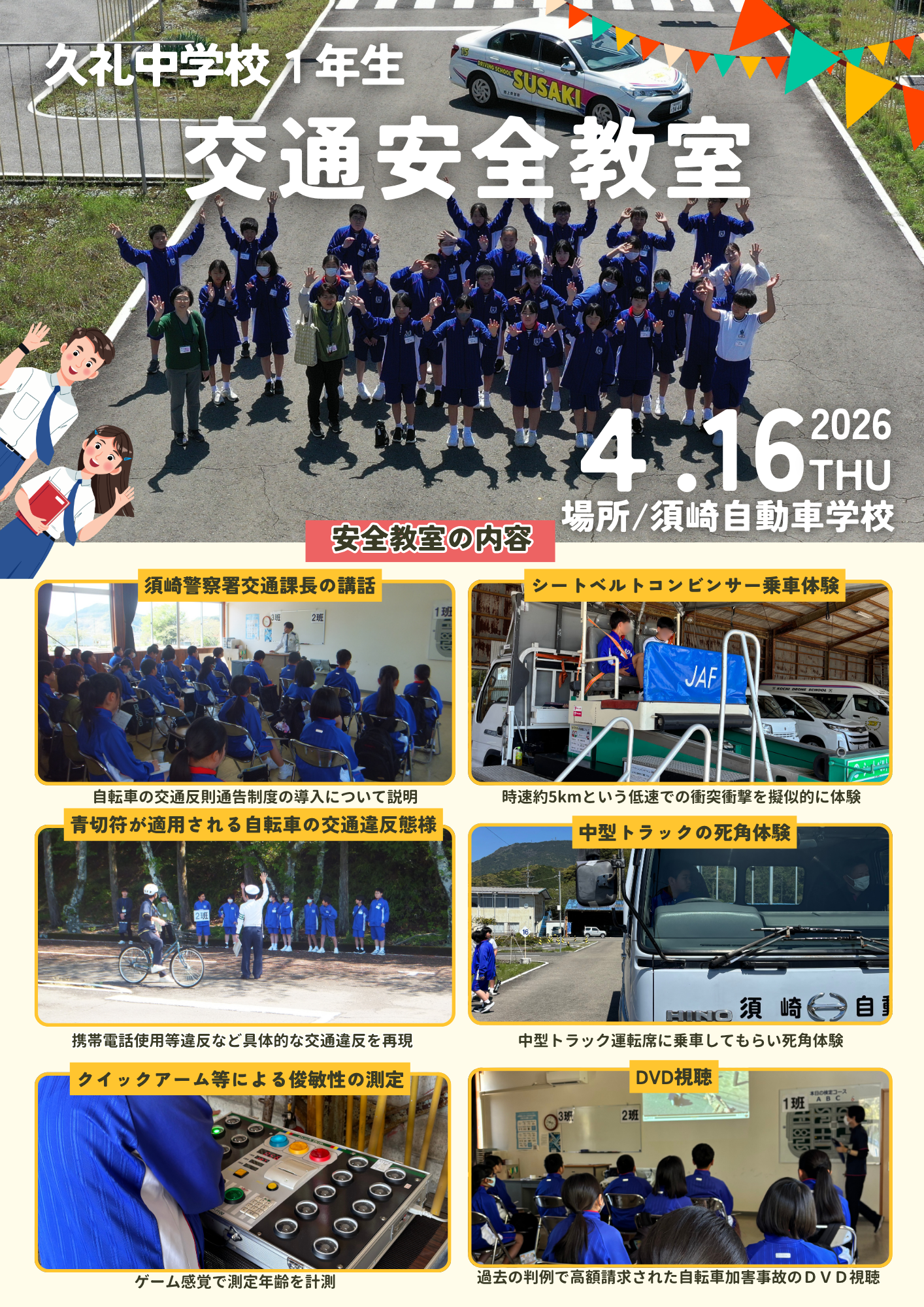 4月16日午前中、須崎警察署・JAF職員さんと合同で中土佐町立久礼中学校1年生を対象にした交通安全教室を開催しました!皆さん大変お疲れ様でした!楽しい中学生活を送ってください。